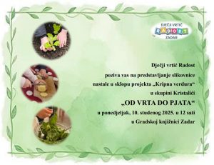 Novosti Pozivnica “Od vrta do pjata” By RadostZD Posted at 6. studenoga 2025. Dječji vrtić Radost poziva vas na predstavljanje slikovnice nastale u sklopu projekta „Kripna verdura“ u skupini Kristalići „OD VRTA DO PJATA“ u ponedjeljak, 10. studenog 2025. u 12 sati u Gradskoj knjižnici Zadar Previous Post Slagalica moga grada Next Post STRUČNI ISPITI za studeni 2025.